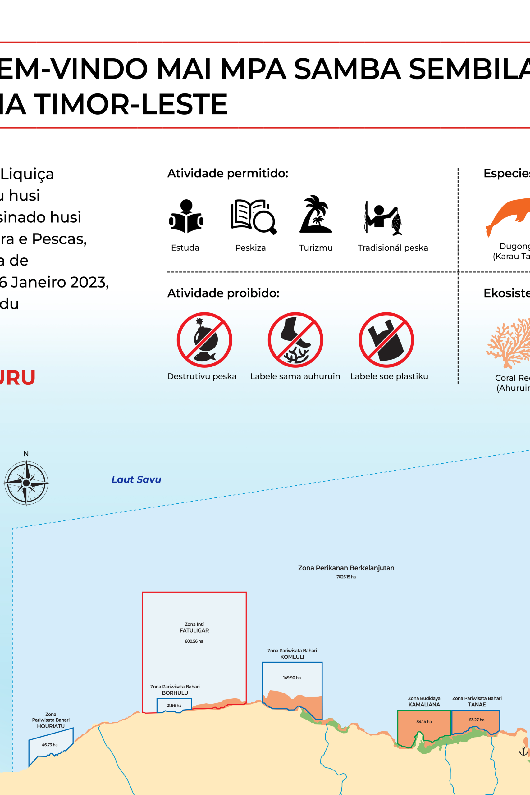The Liquiçá MPA integrates customary law with modern conservation planning. Tara Bandu, Timor-Leste’s traditional system of ecological rules, is formally embedded into the zoning structure, empowering communities to regulate resource use and enforce sustainable practices. The zoning plan includes a Central Zone, Marine Tourism Zone, Aquaculture Zone, and Sustainable Fishing Zone. Within these zones, permitted activities include study, research, tourism, and traditional fishing, while destructive fishing, stepping on corals, and plastic littering are prohibited.